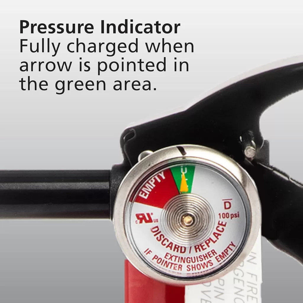 – Pressure Gauge: Kidde includes an easy-to-read pressure gauge that informs you at a glance if the fire extinguisher is fully charged and ready for use.